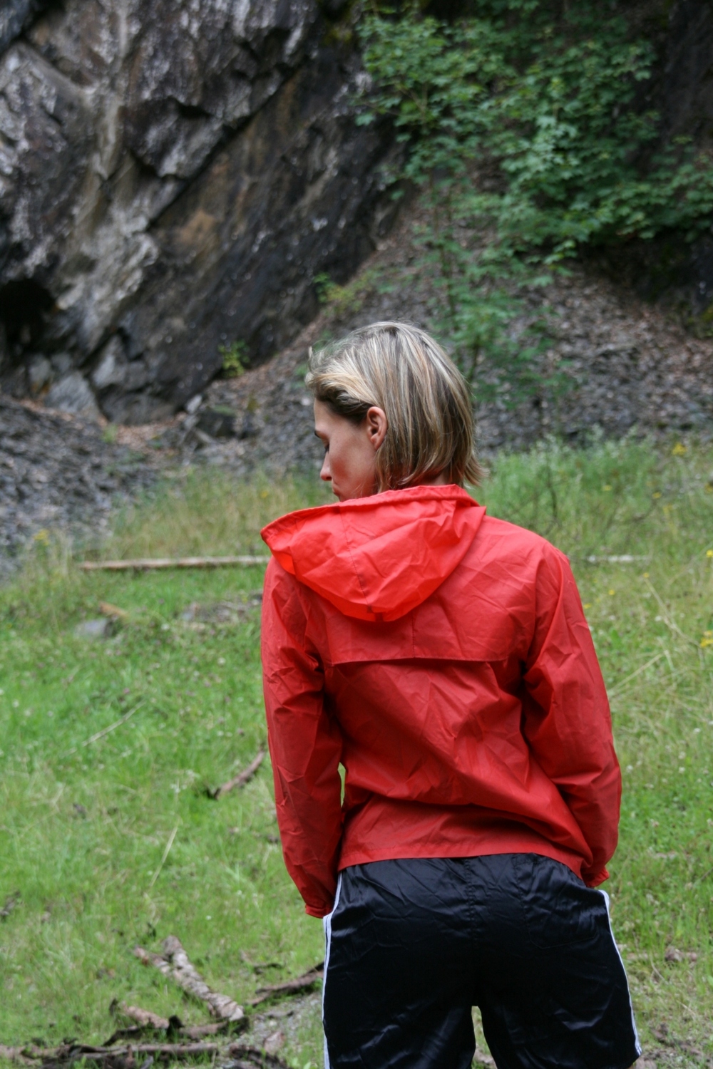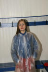 eine etwas enger anliegende Schlupfregenjacke, hier eine No-Name Jacke in Größe 152, kann man auch wunderbar als bauchfreies Kurzjäckchen tragen, dazu wird einfach der saum zwischen Achseln und Brust zusammen gebunden. hier kombiniert übrigens mit einem PAMY Glanznylonröckchen.