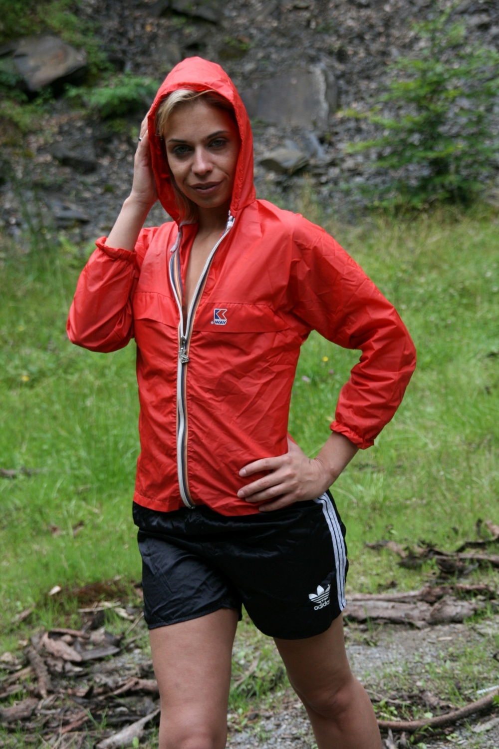 diese Regenjacke, man mag es kaum glauben, ist laut K-way dem Hersteller der Jacke für 8 bis 9-Jährige Kinder gedacht. die Nenngröße ist (3) mehr dazu in der Größentabelle Normalerweise ist eine solche Regenjacke dafür gedacht, dass sie erstens so weit ist, dass man sie bequem über anderen dicken Pullovern oder Anoraks tragen kann, und zweitens der Saum bis über den Po reicht, um ausreichend Nässeschutz zu gewährleisten. So wie hier, nur mit einem BH darunter getragen, passt sie natürlich noch mit Damengröße 36 für den Sommer z.b. für einen Fastivalbesuch.